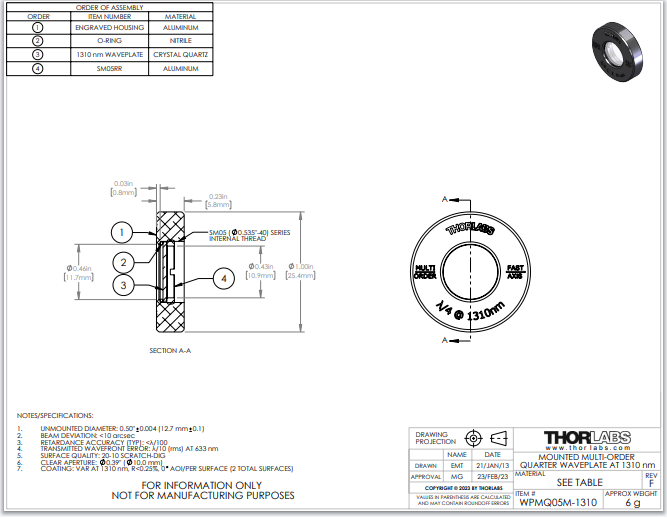 Thorlabs索雷博 WPMQ05M-1310 - Ø1/2英寸多级四分之一波片