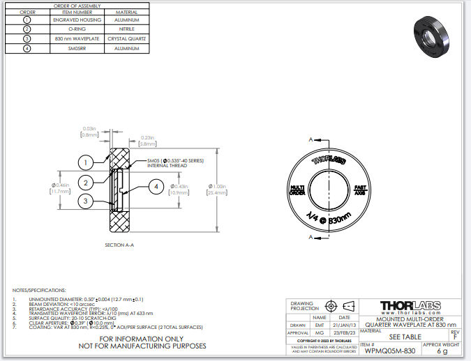 Thorlabs索雷博 WPMQ05M-830 - Ø1/2英寸多级四分之一波片
