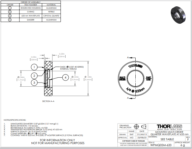 Thorlabs索雷博 WPMQ05M-633 - Ø1/2英寸多级四分之一波片
