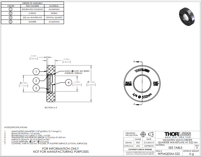 Thorlabs索雷博 WPMQ05M-532 - Ø1/2英寸多级四分之一波片