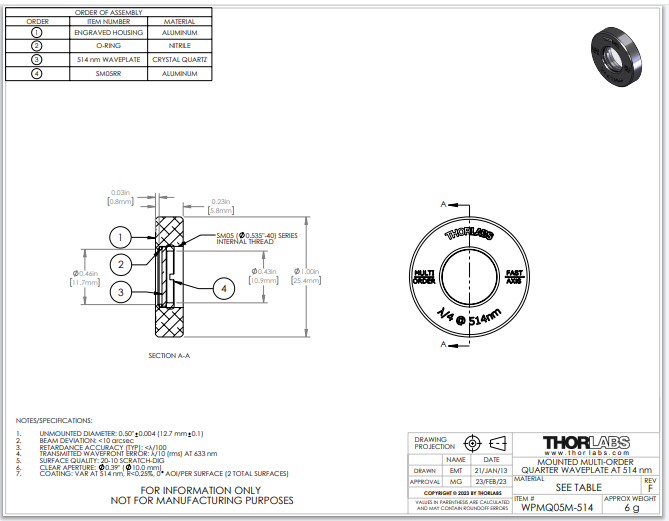 Thorlabs索雷博     WPMQ05M-514 - Ø1/2英寸多级四分之一波片