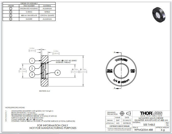 Thorlabs索雷博 WPMQ05M-488 - Ø1/2英寸多级四分之一波片