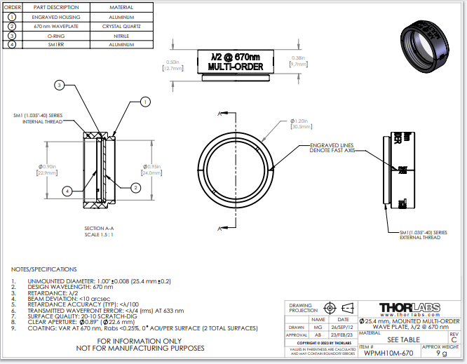 Thorlabs索雷博 WPMH10M-670 - Ø1英寸多级半波片