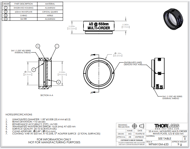Thorlabs索雷博 WPMH10M-633 - Ø1英寸多级半波片
