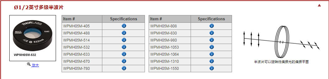 Thorlabs索雷博 WPMH05M-1064 - Ø1/2英寸多级半波片