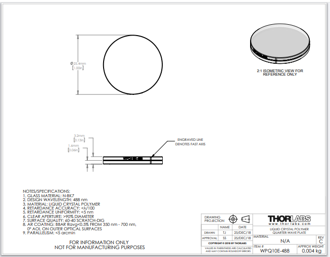 Thorlabs索雷博     WPQ10E-488 - 聚合物零级四分之一波片