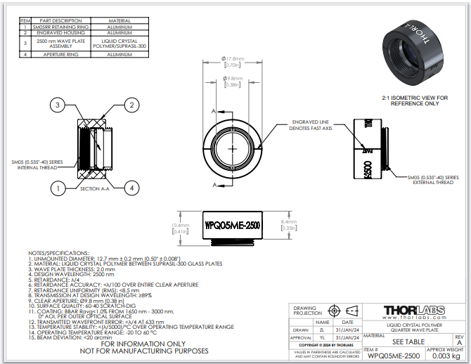 Thorlabs索雷博 WPQ05ME-2500 - 聚合物零级四分之一波片