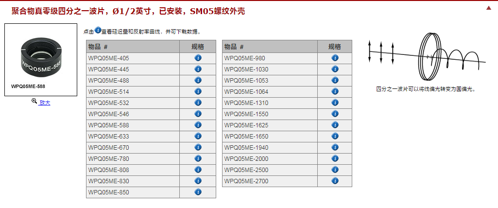 Thorlabs索雷博 WPQ05ME-1940 - 聚合物零级四分之一波片