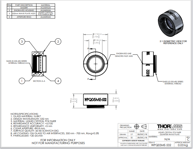 Thorlabs索雷博 WPQ05ME-532 - 聚合物零级四分之一波片