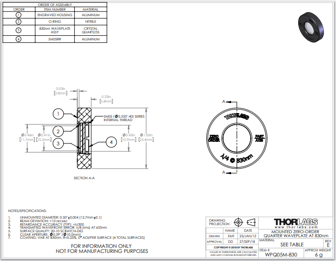 Thorlabs索雷博 WPQ05M-830 - Ø1/2英寸零级四分之一波片