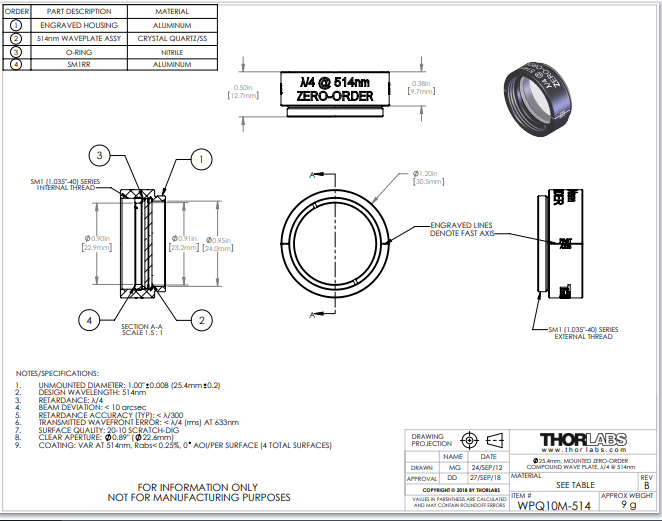 Thorlabs索雷博 WPQ10M-514 - Ø1英寸零级四分之一波片