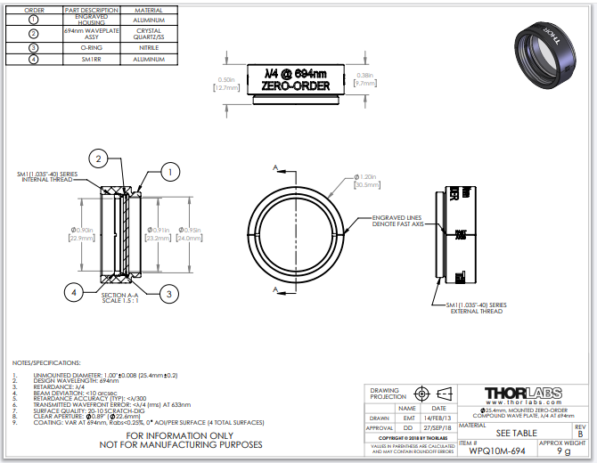 Thorlabs索雷博 WPQ10M-694 - Ø1英寸零级四分之一波片