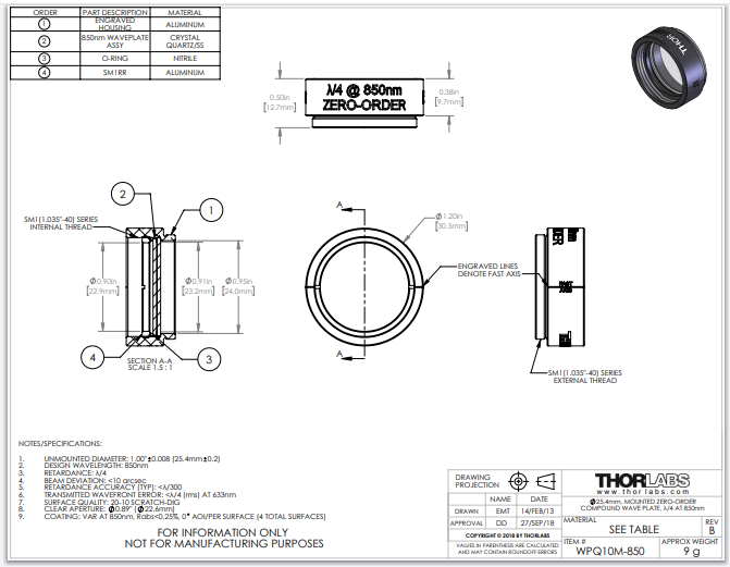 Thorlabs索雷博 WPQ10M-850 - Ø1英寸零级四分之一波片