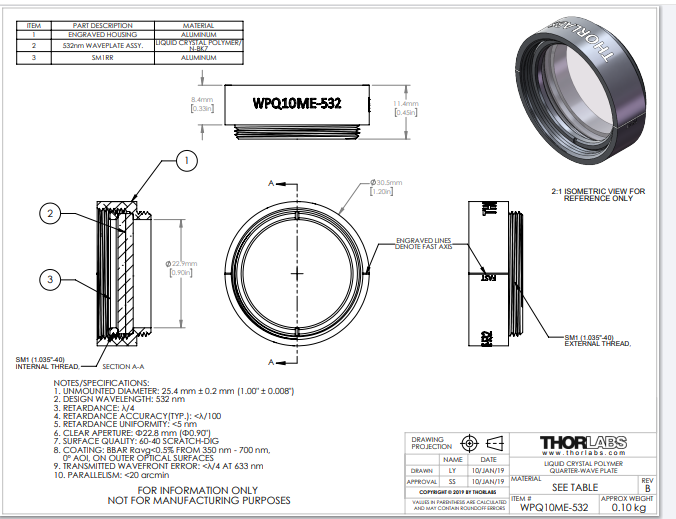 Thorlabs索雷博     WPQ10ME-532 - 聚合物零级四分之一波片