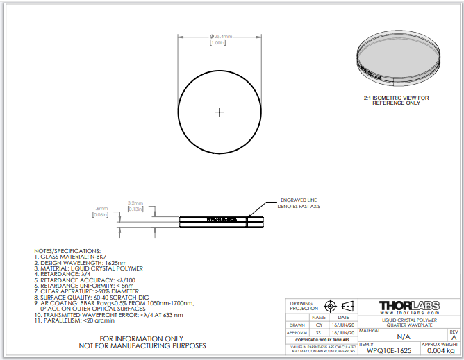 Thorlabs索雷博 WPQ10E-1625 - 聚合物零级四分之一波片