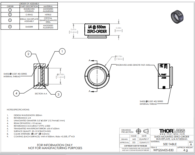 Thorlabs索雷博     WPQSM05-830 - 零级四分之一波片
