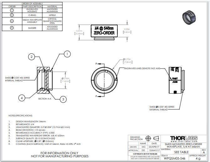 Thorlabs索雷博 WPQSM05-546 - 零级四分之一波片