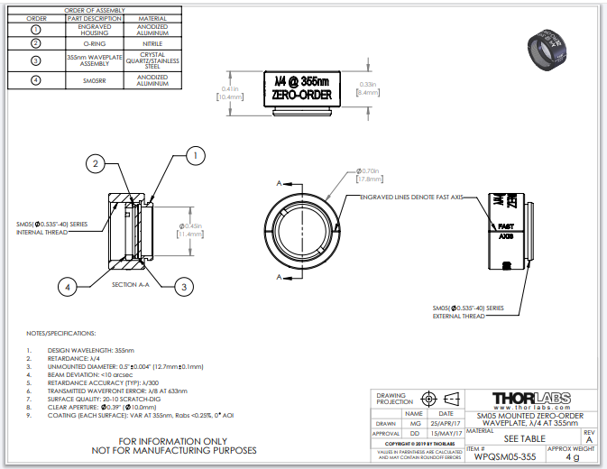 Thorlabs索雷博     WPQSM05-355 - 零级四分之一波片