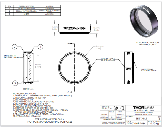 Thorlabs索雷博 WPQ20ME-1064 - 聚合物零级四分之一波片