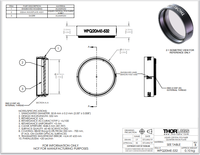 Thorlabs索雷博     WPQ20ME-532 - 聚合物零级四分之一波片