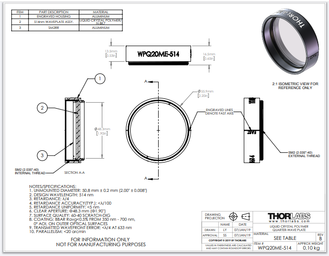 Thorlabs索雷博 WPQ20ME-514 - 聚合物零级四分之一波片
