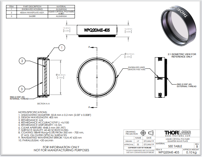 Thorlabs索雷博     WPQ20ME-405 - 聚合物零级四分之一波片