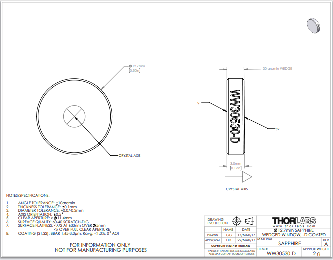 Thorlabs索雷博 WW30530-D - Ø1/2英寸楔形蓝宝石窗口片