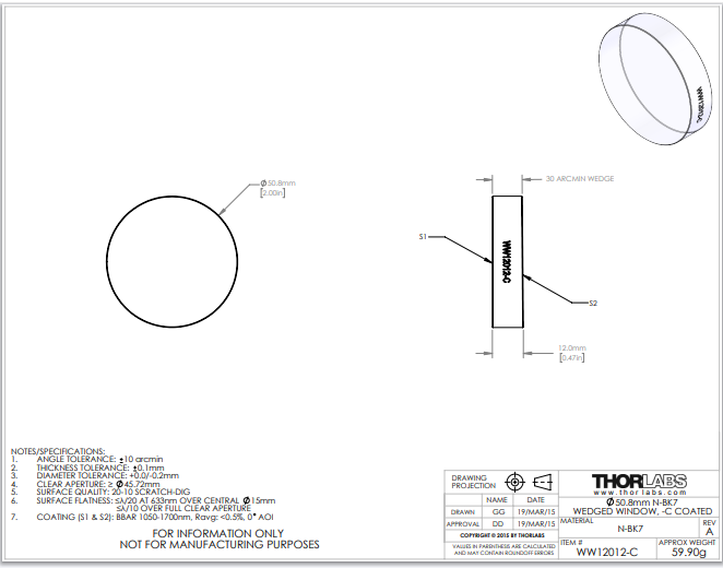 Thorlabs索雷博 WW12012-C - 楔形N-BK7窗口片