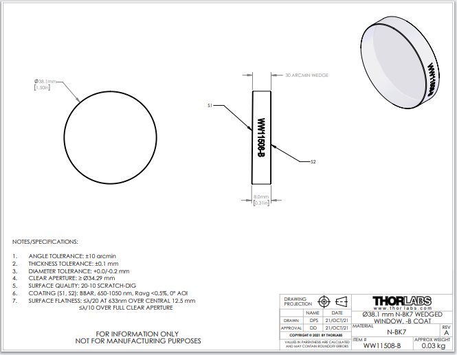 Thorlabs索雷博     WW11508-B - 楔形N-BK7窗口片