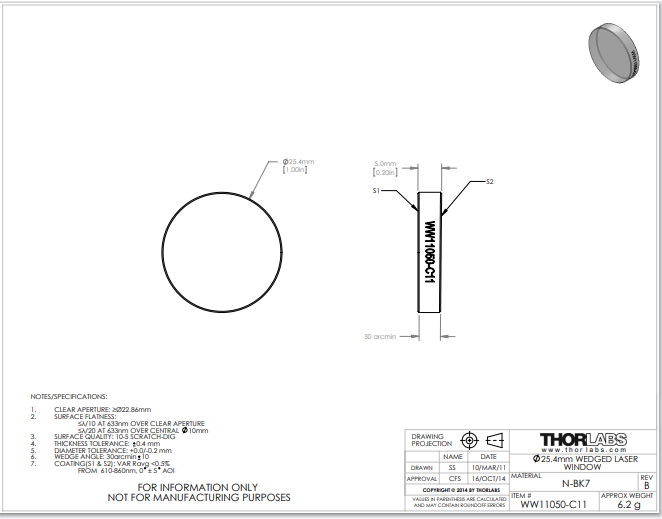 Thorlabs索雷博 WW11050-C11 - Ø1英寸楔形N-BK7激光窗口片