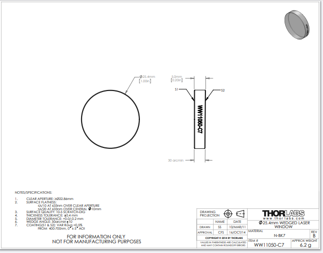 Thorlabs索雷博     WW11050-C7 - Ø1英寸楔形N-BK7激光窗口片