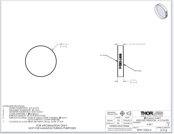 Thorlabs索雷博 WW11050-A - 楔形N-BK7窗口片