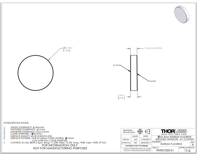 Thorlabs索雷博 WW01050-E1 - 楔形氟化钡窗口片