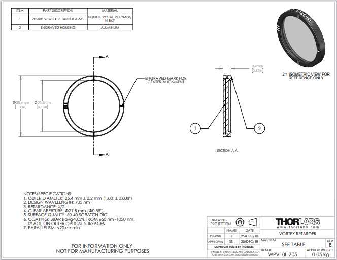Thorlabs索雷博     WPV10L-705 - 零级涡旋半波片