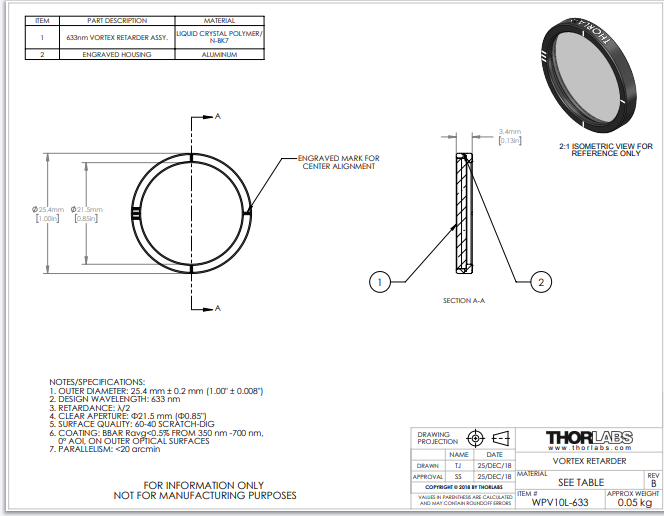 Thorlabs索雷博 WPV10L-633 - 零级涡旋半波片