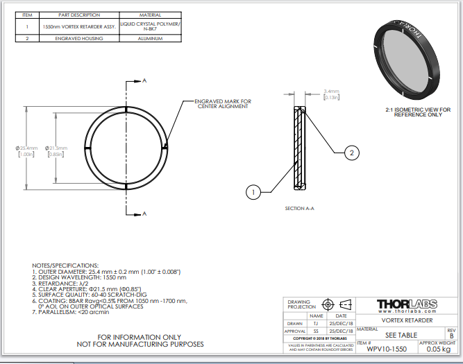 Thorlabs索雷博 WPV10-1550 - 零级涡旋半波片