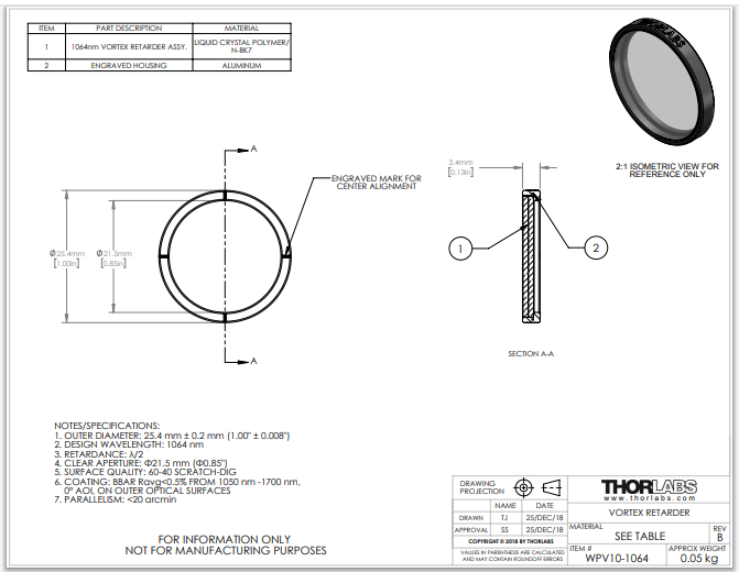 Thorlabs索雷博 WPV10-1064 - 零级涡旋半波片