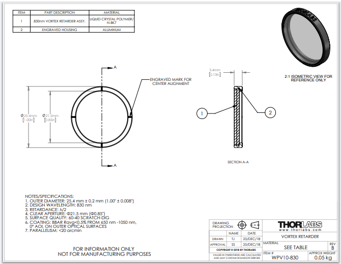 Thorlabs索雷博 WPV10-830 - 零级涡旋半波片