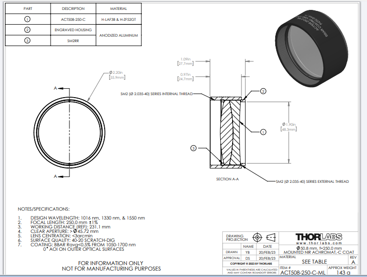 Thorlabs索雷博 ACT508-250-C-ML 消色差双胶合透镜