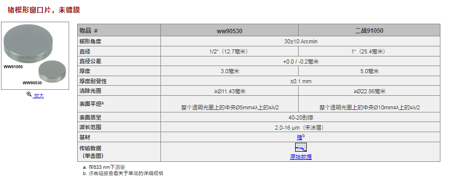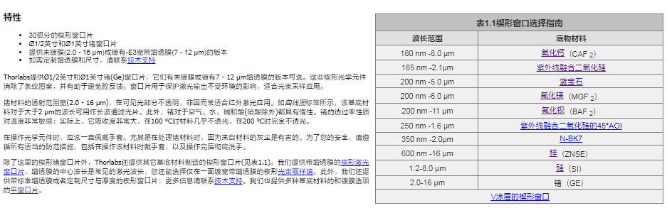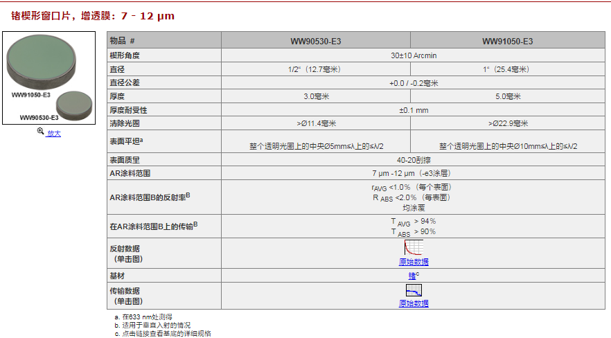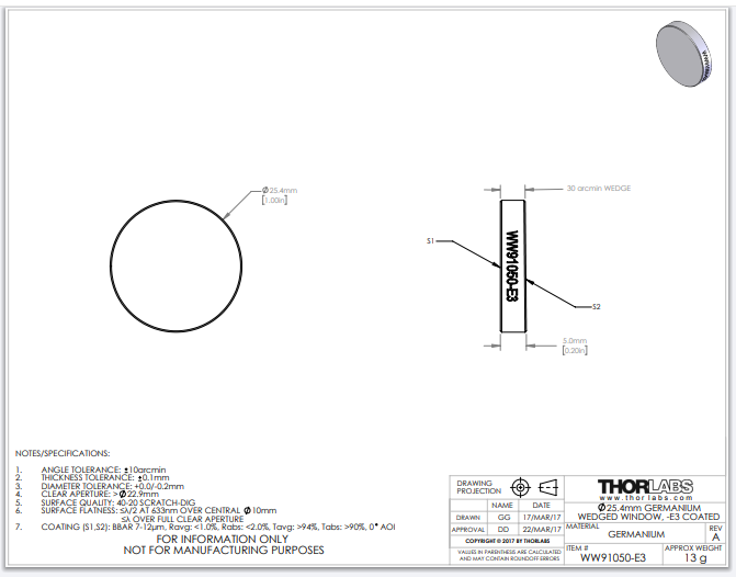 Thorlabs索雷博     WW91050-E3 - 锗楔形窗口片