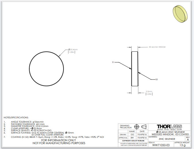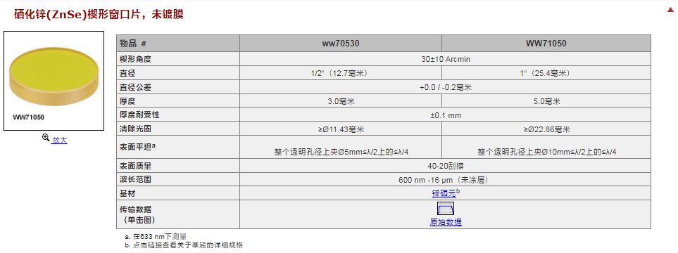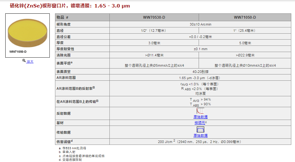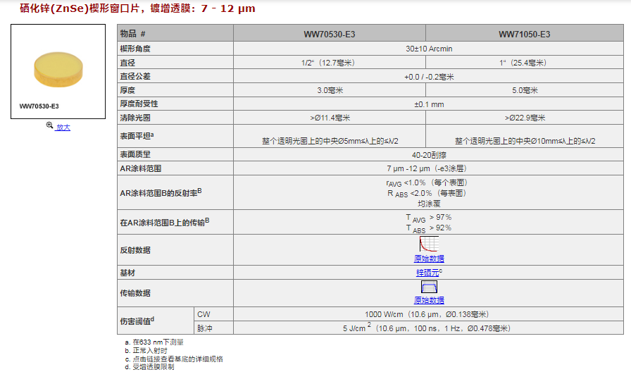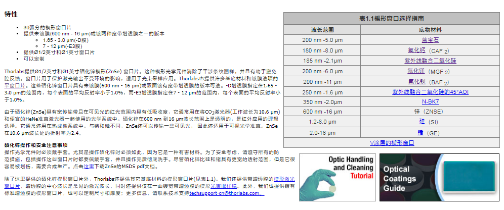 Thorlabs索雷博 WW71050-E3 - 楔形硒化锌窗口片
