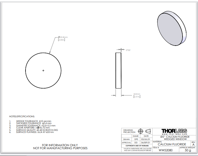 Thorlabs索雷博     WW52080 - 氟化钙楔形窗口片
