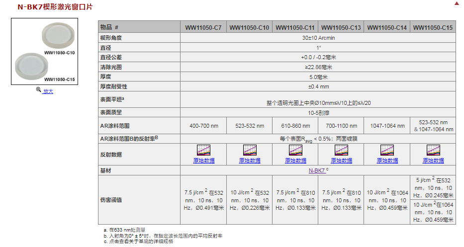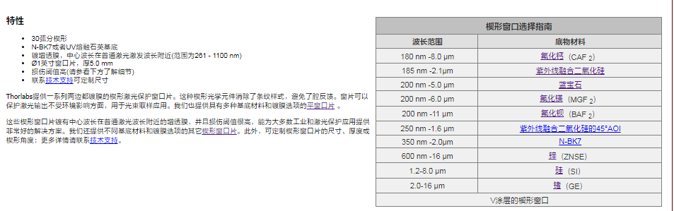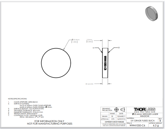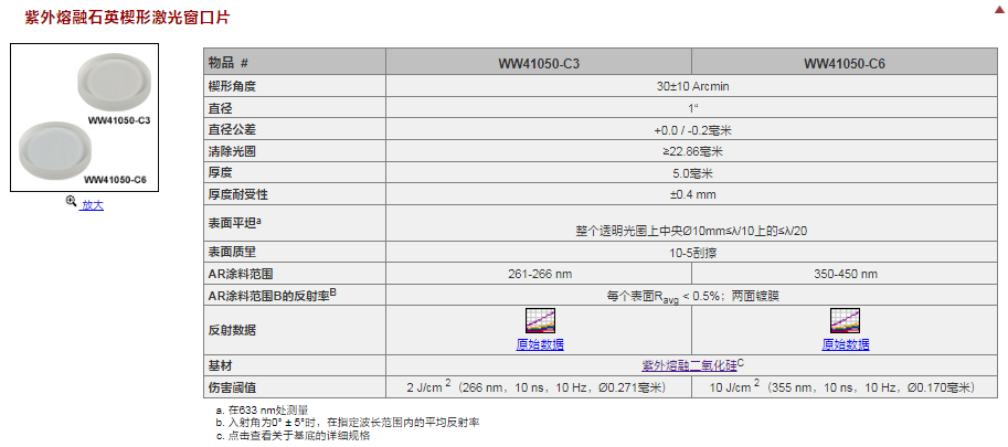 Thorlabs索雷博 WW41050-C6 - Ø1英寸楔形熔融石英激光窗口片