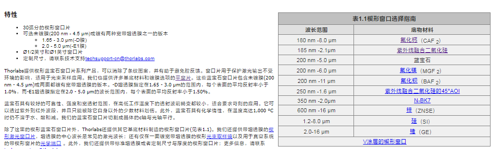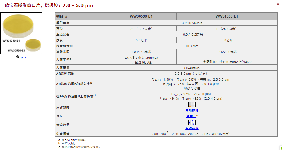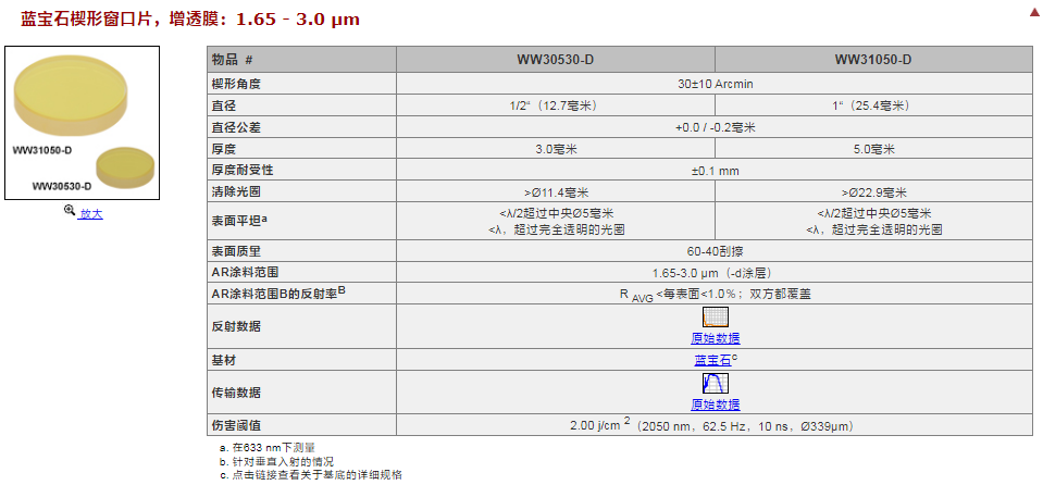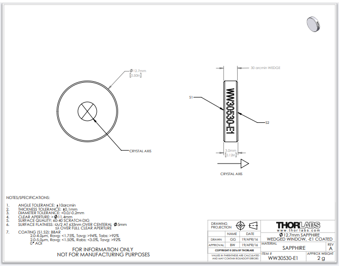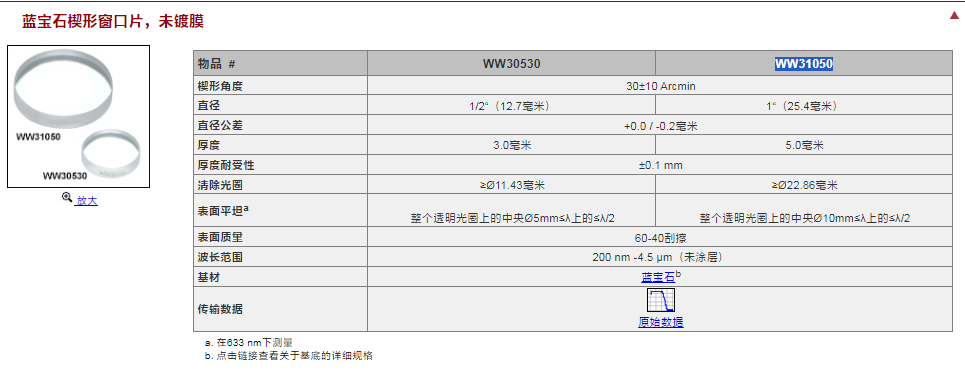 Thorlabs索雷博 WW30530-E1 - Ø1/2英寸楔形蓝宝石窗口片