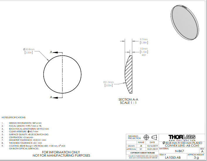 Thorlabs索雷博 LA1050-AB 平凸透镜