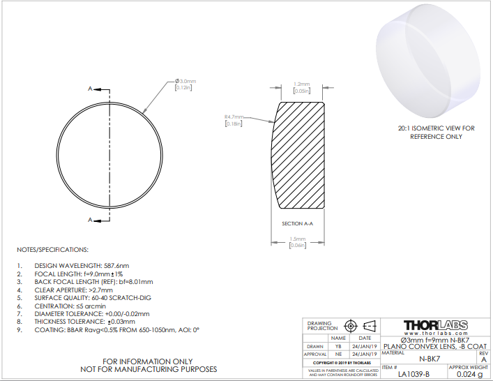 Thorlabs索雷博 LA1039-B 平凸透镜