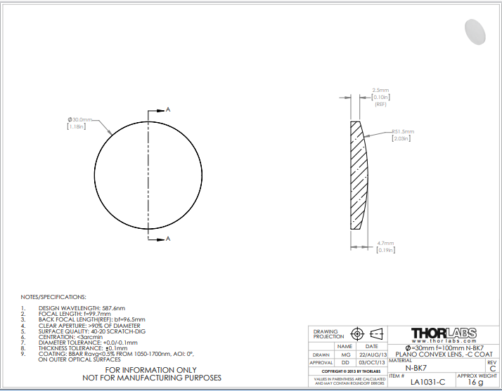 Thorlabs索雷博 LA1031-C 平凸透镜