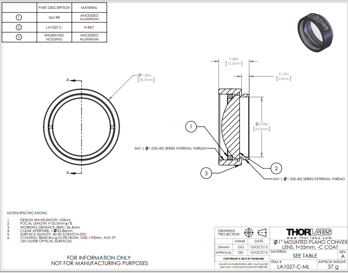 Thorlabs索雷博 LA1027-C-ML 平凸透镜