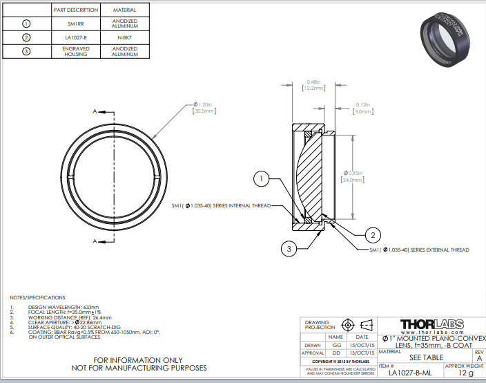 Thorlabs索雷博 LA1027-B-ML 平凸透镜