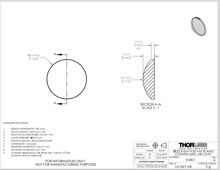 Thorlabs索雷博 LA1027-AB 平凸透镜